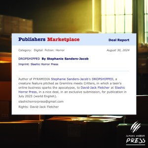 - New book coming in July 2025!That’s right—Slashic Horror Press will be publishing my next silly and satirical novel, DROPSHIPPED, in July 2025. This book is a creature feature reminiscentContinue reading “New book coming in July 2025!”