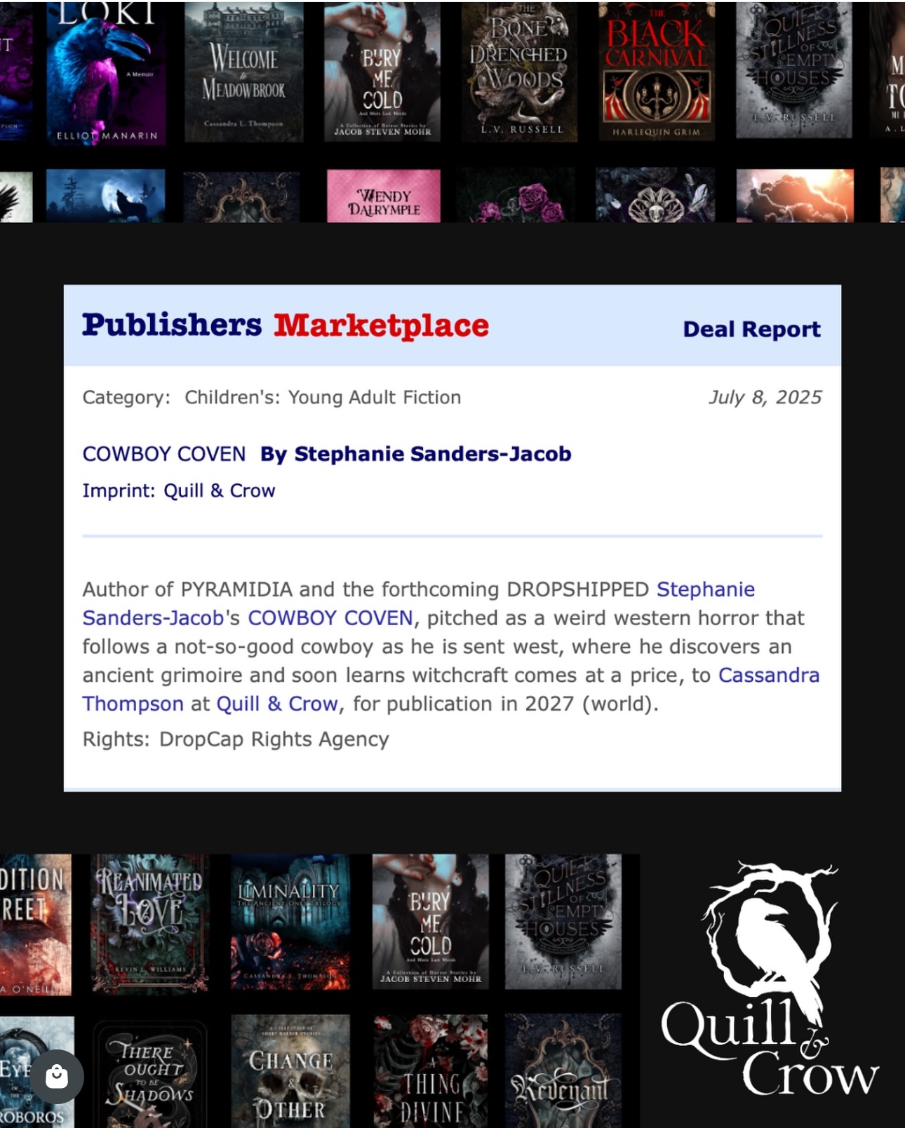 Cowboy Coven, my weird western about love, witchcraft, and what may or may not be Mothman is set to come out in 2027 with Quill & Crow Publishing House! Stay tuned for more information!